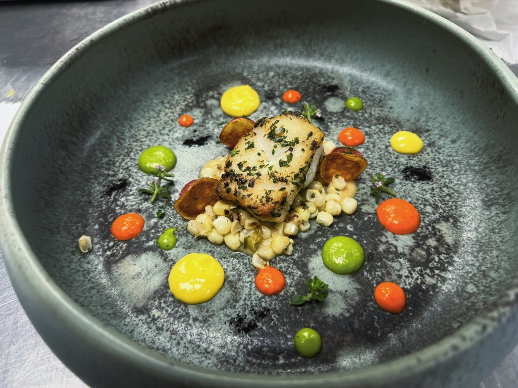 Competing for the N.C. Chef of the Year with the North Carolina Restaurant & Lodging Association (NCRLA) and Agriculture, I wanted to create a dish that celebrated the region’s rich culinary heritage while showcasing precision and artistry. This plate—pan-seared golden tilefish with corn coulis and seasonal peppers—not only highlighted locally sourced ingredients but also embraced the craftsmanship of North Carolina pottery, plated on Haand ceramics.