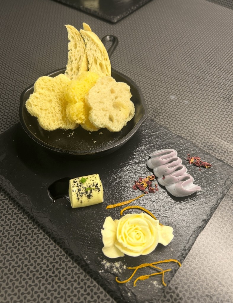 Presented on black slate, the dish had a natural, earthy aesthetic, with butter piped in elegant floral shapes, delicate dried petals scattered across the plate, and a fine dusting of black salt for contrast. The crisp textures of the bread and the softness of the butters played against each other, setting the tone for the evening—a meal where every element was as visually striking as it was flavorful.