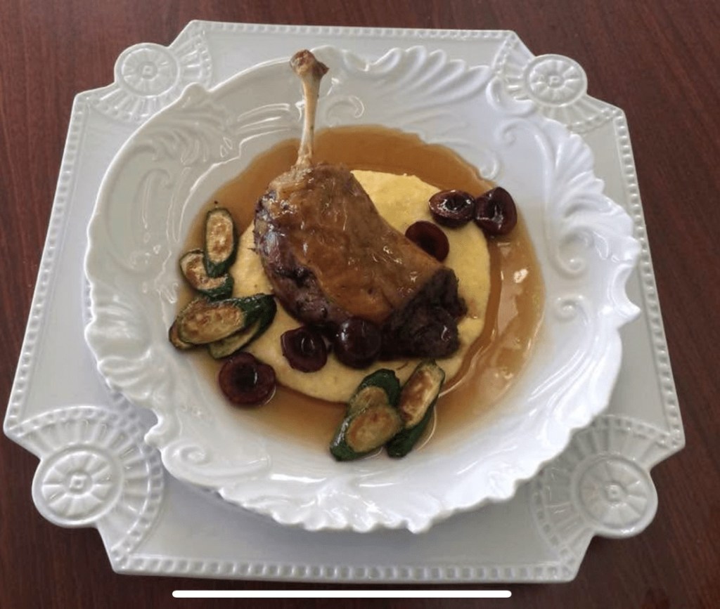 Slow-Cooked Elegance: Duck Confit with Polenta, Cherries & Zucchini