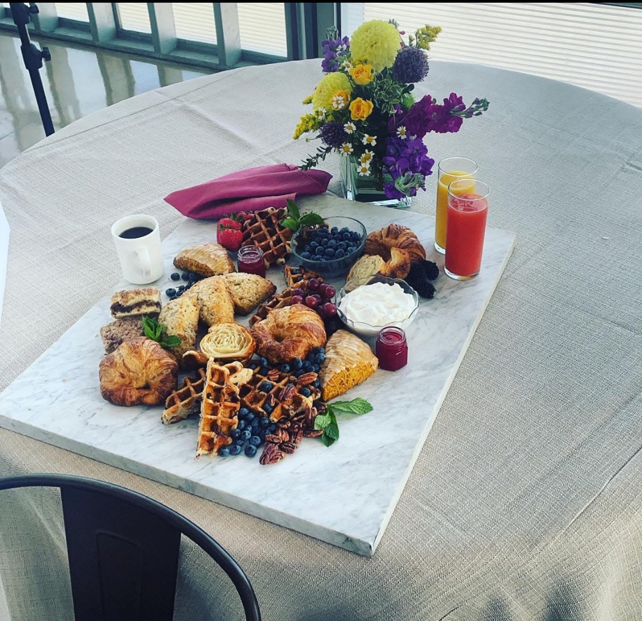 Instead of traditional plated breakfast service, we chose a large marble board as our canvas, allowing the ingredients to naturally flow and interact. The mix of textures—from flaky croissants and buttery pastries to the deep golden waffles with crisp edges—creates an inviting, abundant feel. Each element was placed with intention, ensuring a sense of effortless luxury while still feeling organic and natural.