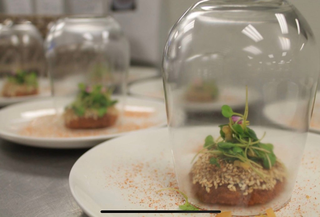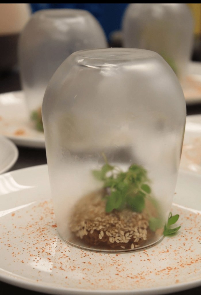 Each plate is presented beneath a glass cloche, trapping in a cloud of fragrant lemon and warm ginger vapor. The moment the cloche is lifted, a subtle, almost ethereal mist escapes, surrounding the dish in an aromatic burst of citrus and spice. It’s an invitation—before even taking a bite, guests are already immersed in the dish’s essence.