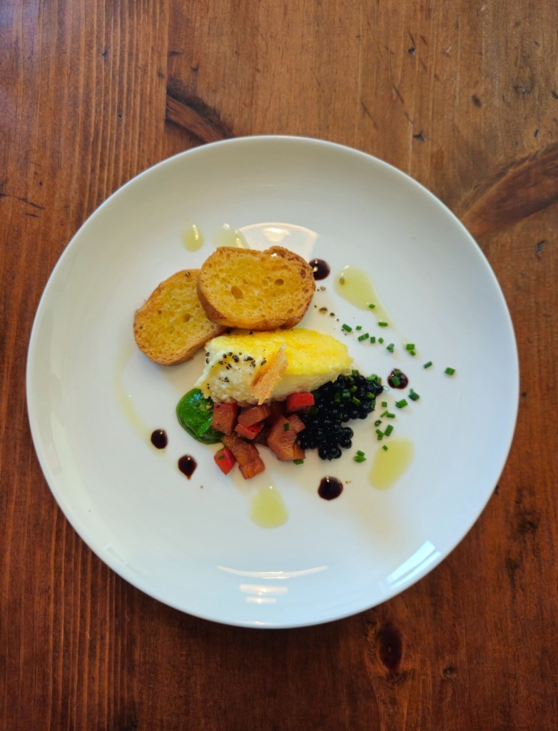 The flan, smooth and rich with aged Parmigiano-Reggiano, was the star—delicate yet packed with umami. Crisp brioche toasts provided crunch, while roasted peppers added a subtle smokiness. To balance the richness, a balsamic reduction and balsamic pearls brought bursts of acidity and sweetness, finishing with a drizzle of olive oil and chives for freshness.