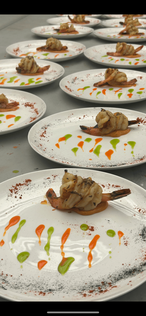The plate itself became a canvas, featuring bright splashes of herbaceous green and fiery orange sauces, carefully arranged to create movement. A dusting of smoked paprika and black seasoning enhanced both the visual impact and the flavor profile, tying the elements together seamlessly. The shrimp, slightly charred and kissed with citrus, delivered a perfect balance of sweet, smoky, and tangy flavors, making this dish a true sensory experience.